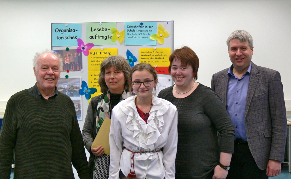 Das große Los für den Förderverein des Weilburger Gymnasiums bei der Preisverleihung des Wettbewerbs „Lesen macht Freu(n)de“ in Gießen hatte Janina Sartorius – dreifache Gewinnerin des Schreibwettbewerbs „Ohne Punkt und Komma“ – gezogen. Zusammen mit Elisabeth Kuhnigk, Eugen Rudolf Ancke sowie Gudrun Ehlert-Lorenz und Bärbel Kamphausen-Muser bildete sie die Weilburger Delegation, die zusammen mit 32 anderen Schulen und Bildungseinrichtungen aus dem Geschäftsbereich der Volksbank Mittelhessen zur Abschlussveranstaltung nach Gießen eingeladen worden war. Insgesamt 15.000 Euro schüttete das Kreditinstitut durch Losverfahren an die durch eine Vorauswahl ermittelten Gewinner aus, wobei der Höchstbetrag von 1000 Euro drei Mal, die Summe von 750 Euro fünf Mal vergeben wurde.