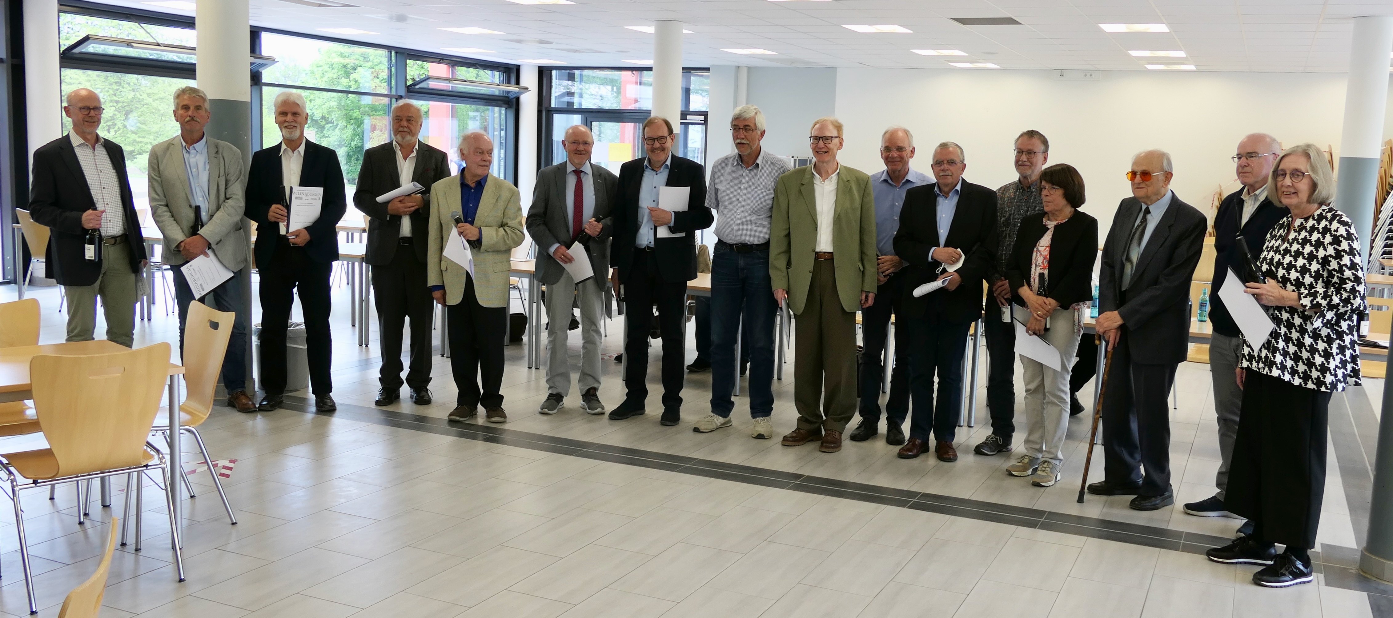 Der Vorsitzende konnte bei den traditonellen Ehrungen für langjährige Mitgliedschaft mit Elsbeth Volk aus Niedershausen eine Abiturientin des Jahres 1947 begrüßen, die nun 75 Jahre dem Verein angehört. Frau Volk erzählte kurz von den Schwierigkeiten während des Nachkriegsabiturs. Im Winter sei der Unterricht wegen fehlendem Heizmaterial praktisch ausgefallen, Hausaufgaben hätten wegen Papiermangels auf Tapetenresten angefertigt werden müssen und nicht zuletzt sei es den Abiturienten wegen des Unterrichtsausfalls gelungen, den Prüfungstermin um ein halbes Jahr zu verschieben.