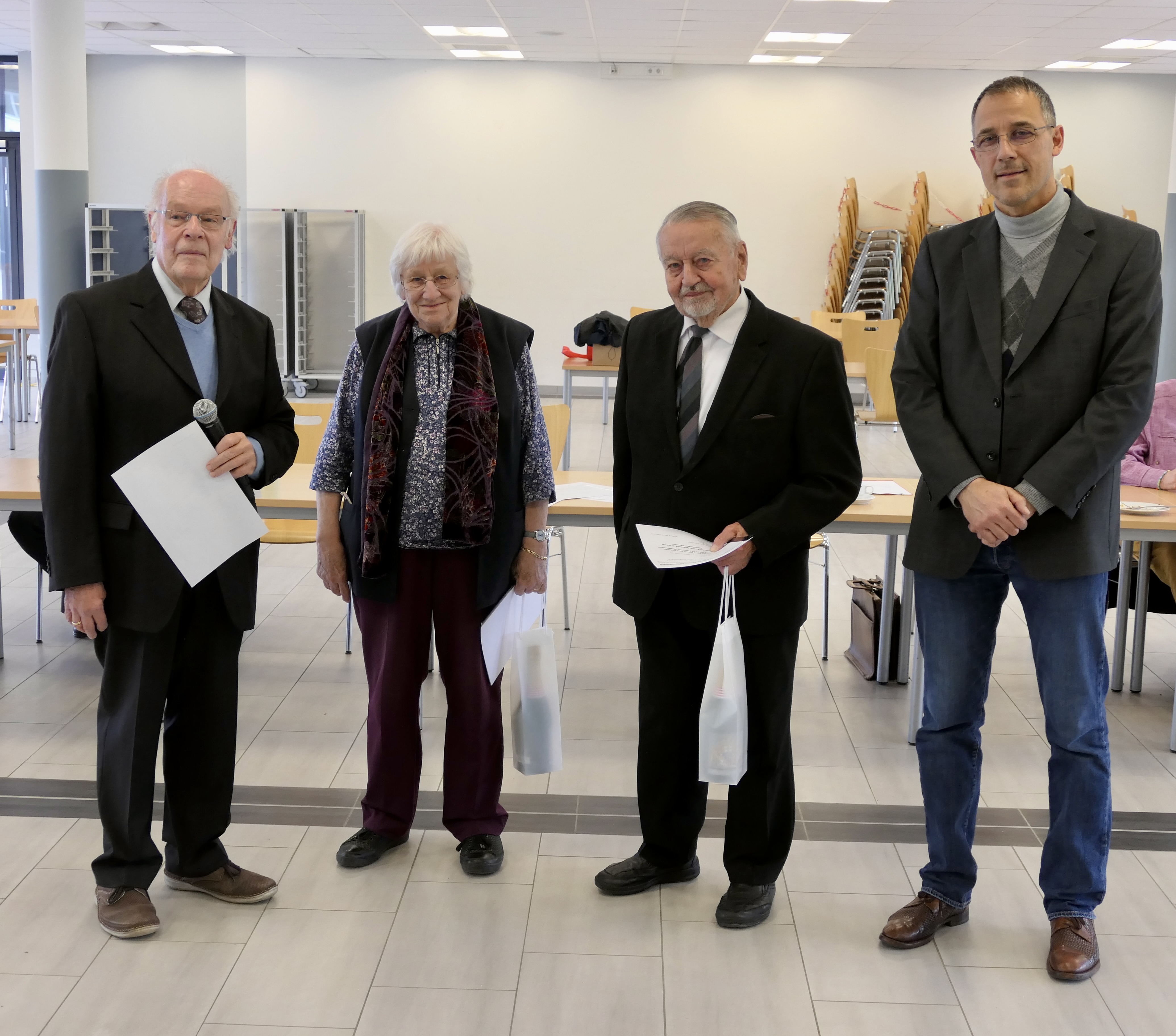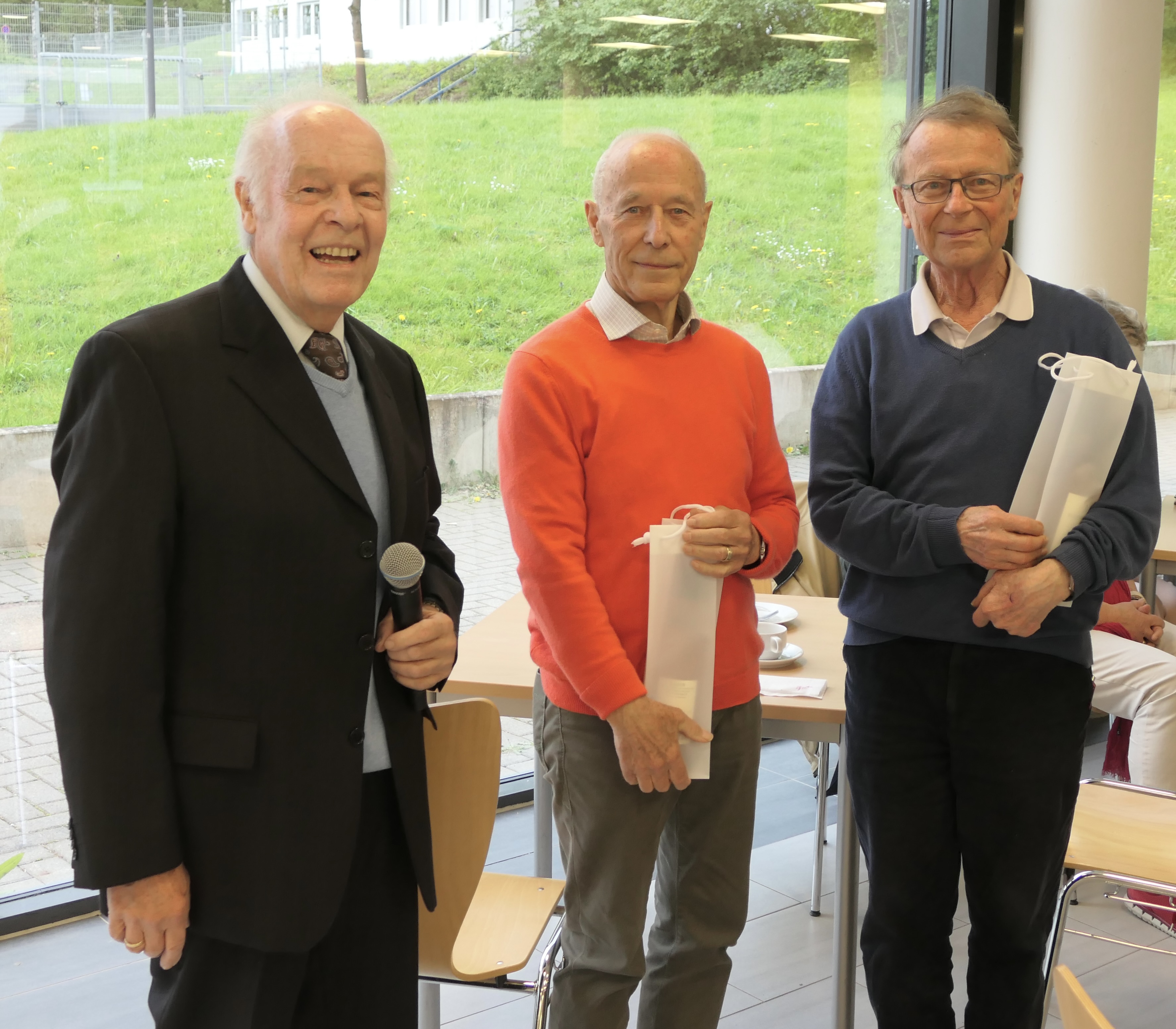 Dieser Würdigung schloss sich die traditionelle Ehrung für langjährige Vereinszugehörigkeit an. Eugen Rudolf Ancke und der 2. Vorsitzende Peter Ludwig überreichten dazu den Anwesenden unter den für 25-, 40-, 50-, 60-, 70-, 75- und 80-jährige Mitgliedschaft zu Ehrenden eine Erinnungsmappe und eine Flasche Kaiserstühler Wein. Ancke verlas auch eine Grußbotschaft von Dr. Ludhard Schlitt aus Haddonfield/USA, der seit 80 Jahren Vereinsmitglied ist.